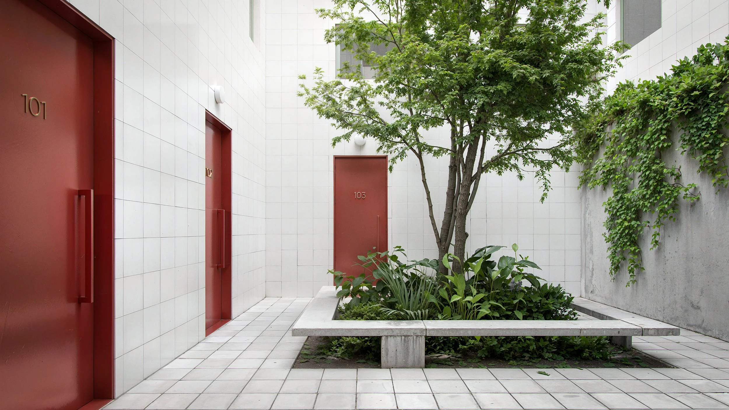 Urban courtyard with tiled walkways, white tiled walls, red elevator doors, and a small landscaped area with a tree and green plants.